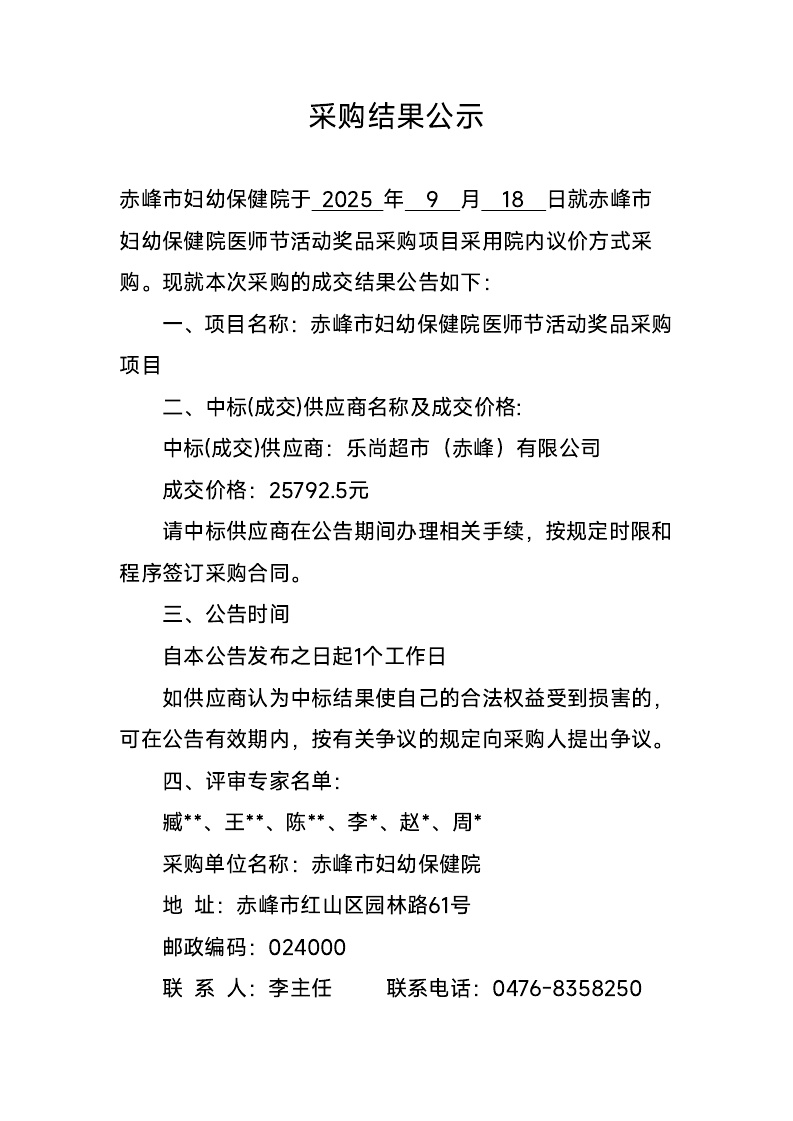 赤峰市妇幼保健院医师节活动奖品采购项目采购结果公示