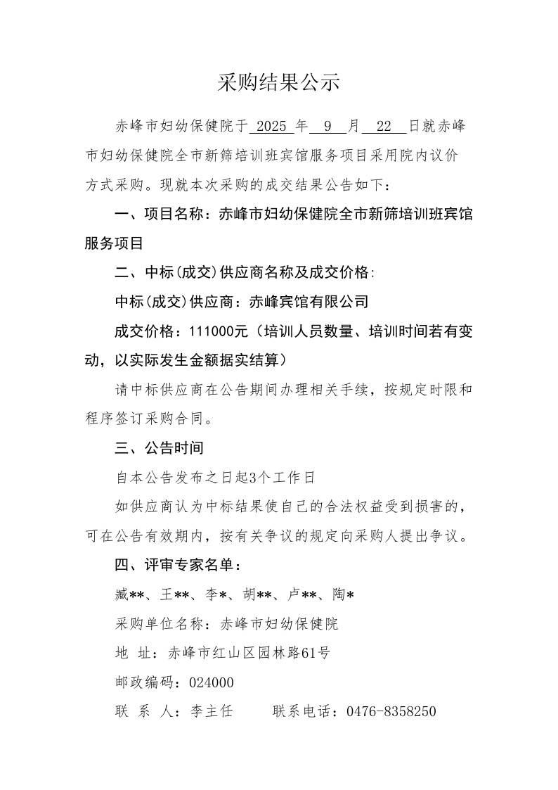 赤峰市妇幼保健院全市新筛培训班宾馆服务项目采购结果公示
