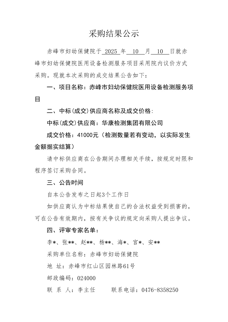 赤峰市妇幼保健院医用设备检测服务项目采购结果公示