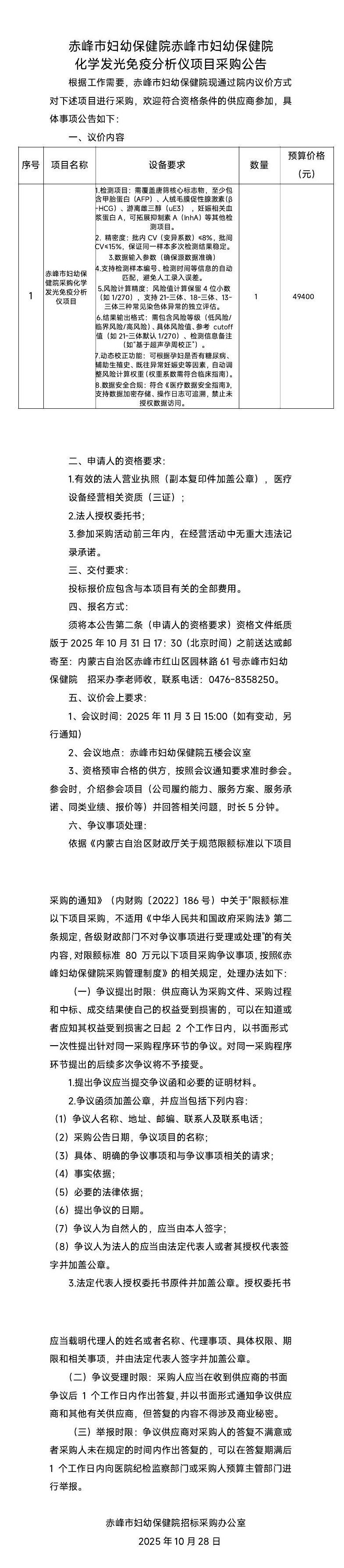 赤峰市妇幼保健院采购化学发光免疫分析仪项目采购公告