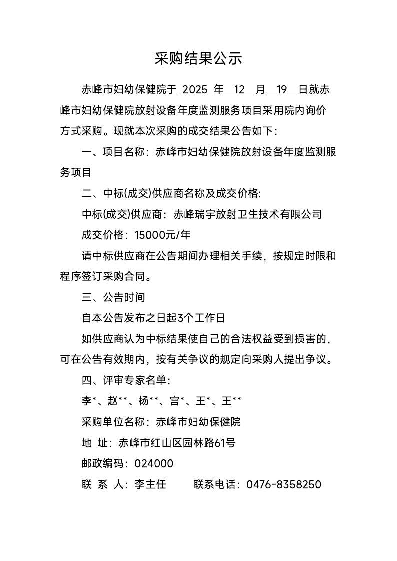 赤峰市妇幼保健院放射设备年度监测服务项目采购结果公示