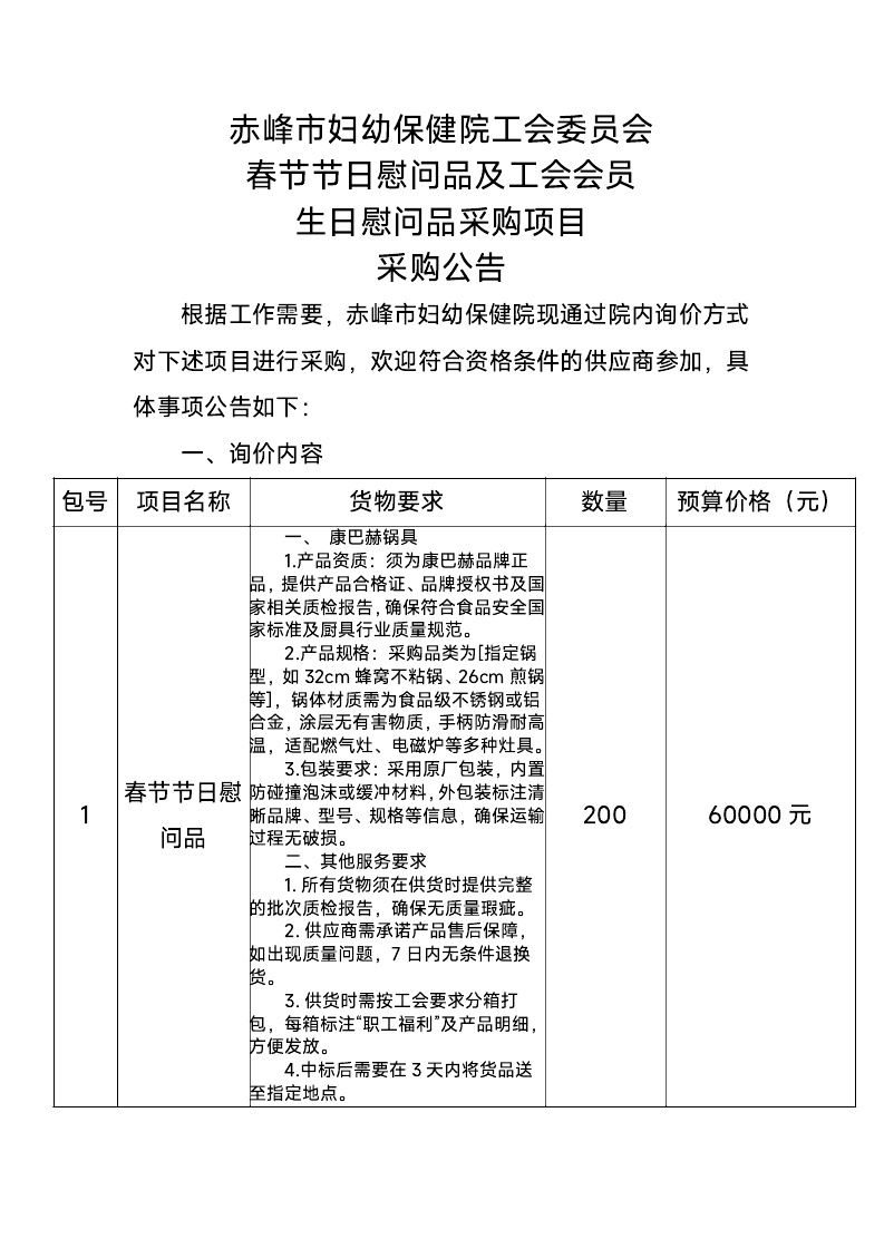 赤峰市妇幼保健院工会委员会采购春节节日慰问品及工会会员生日慰问品采购项目采购公告