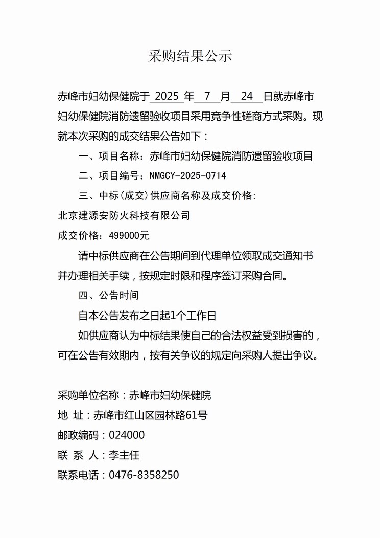 赤峰市妇幼保健院消防遗留验收项目采购结果公示