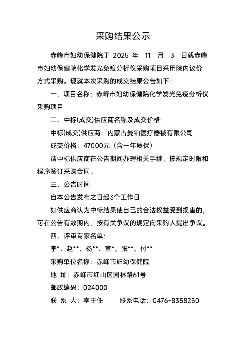 赤峰市妇幼保健院化学发光免疫分析仪采购项目采购结果公示