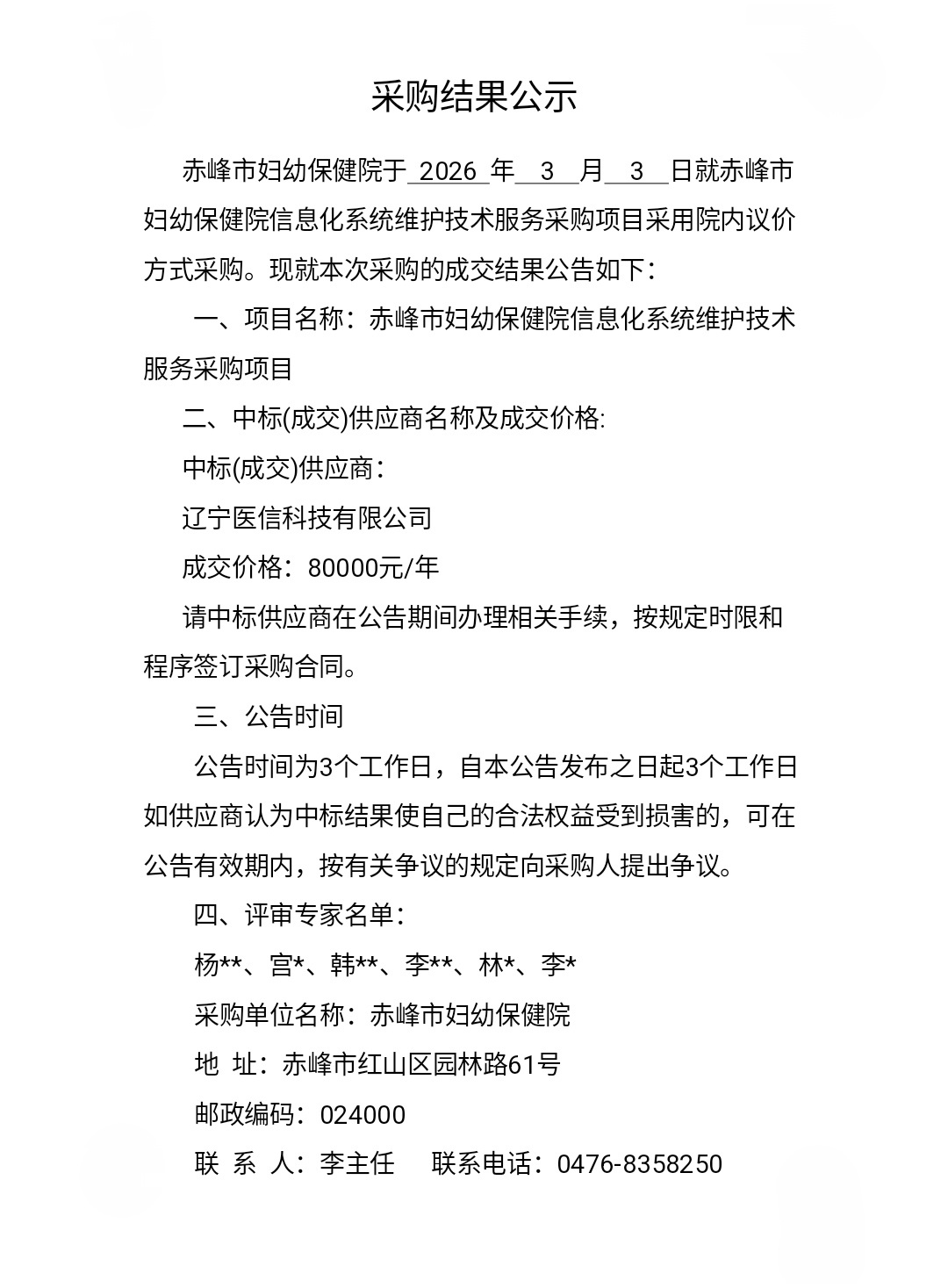 赤峰市妇幼保健院信息化系统维护技术服务采购结果通知