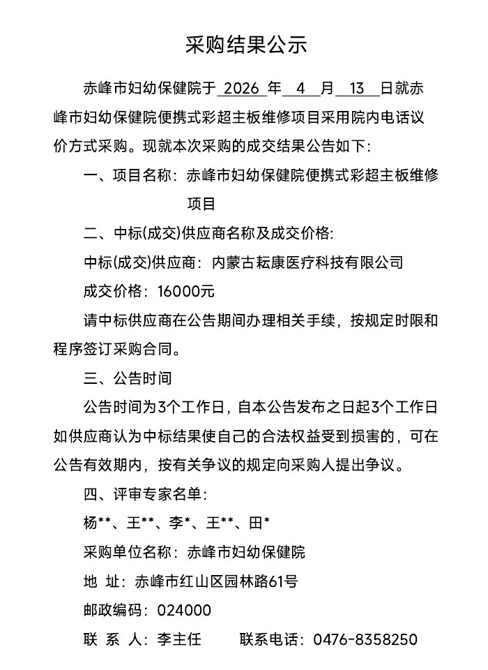 赤峰市妇幼保健院便携式彩超主板维修项目采购结果公示